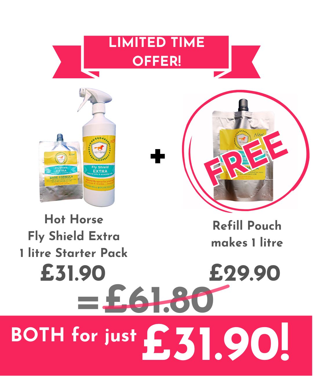 Special Offer size = 1 litre bottle + 1 x 100ml pouch Hot Horse Fly Shield Extra concentrate plus 1 extra pouch for free!